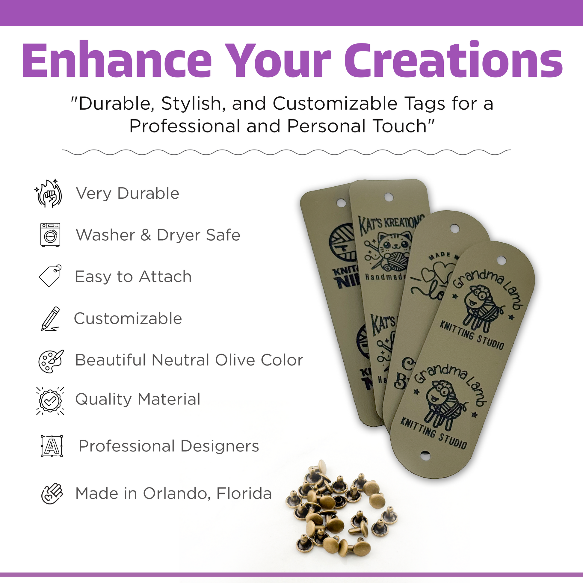 🎨 Available in rich olive green, these labels fold neatly over your work and fasten securely with snap rivets. Personalize with your name, logo, or a phrase that speaks to your style.