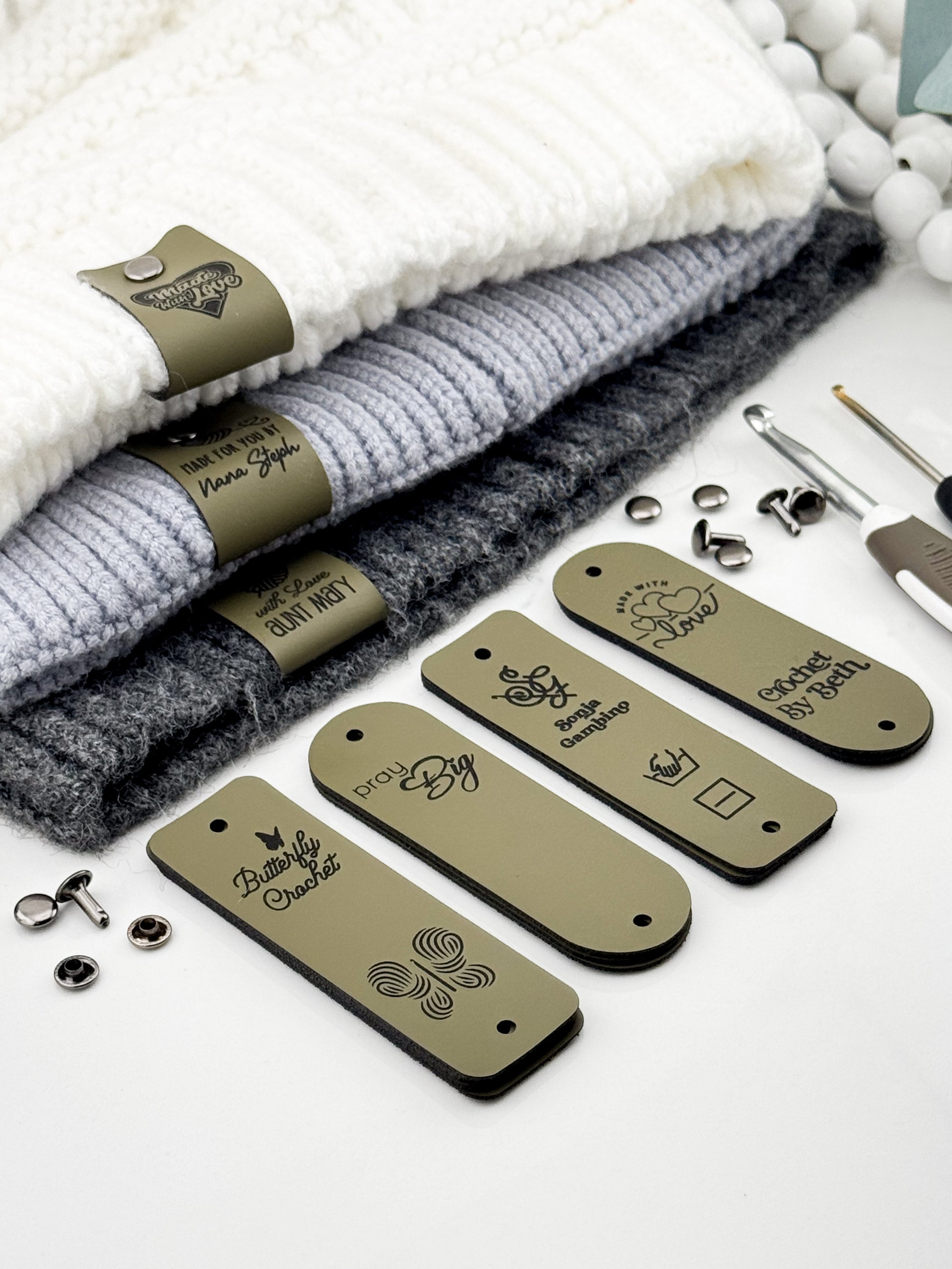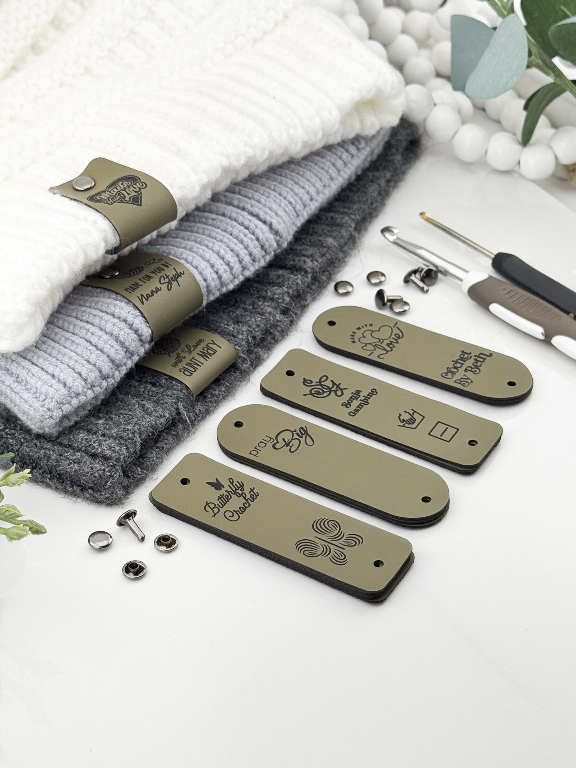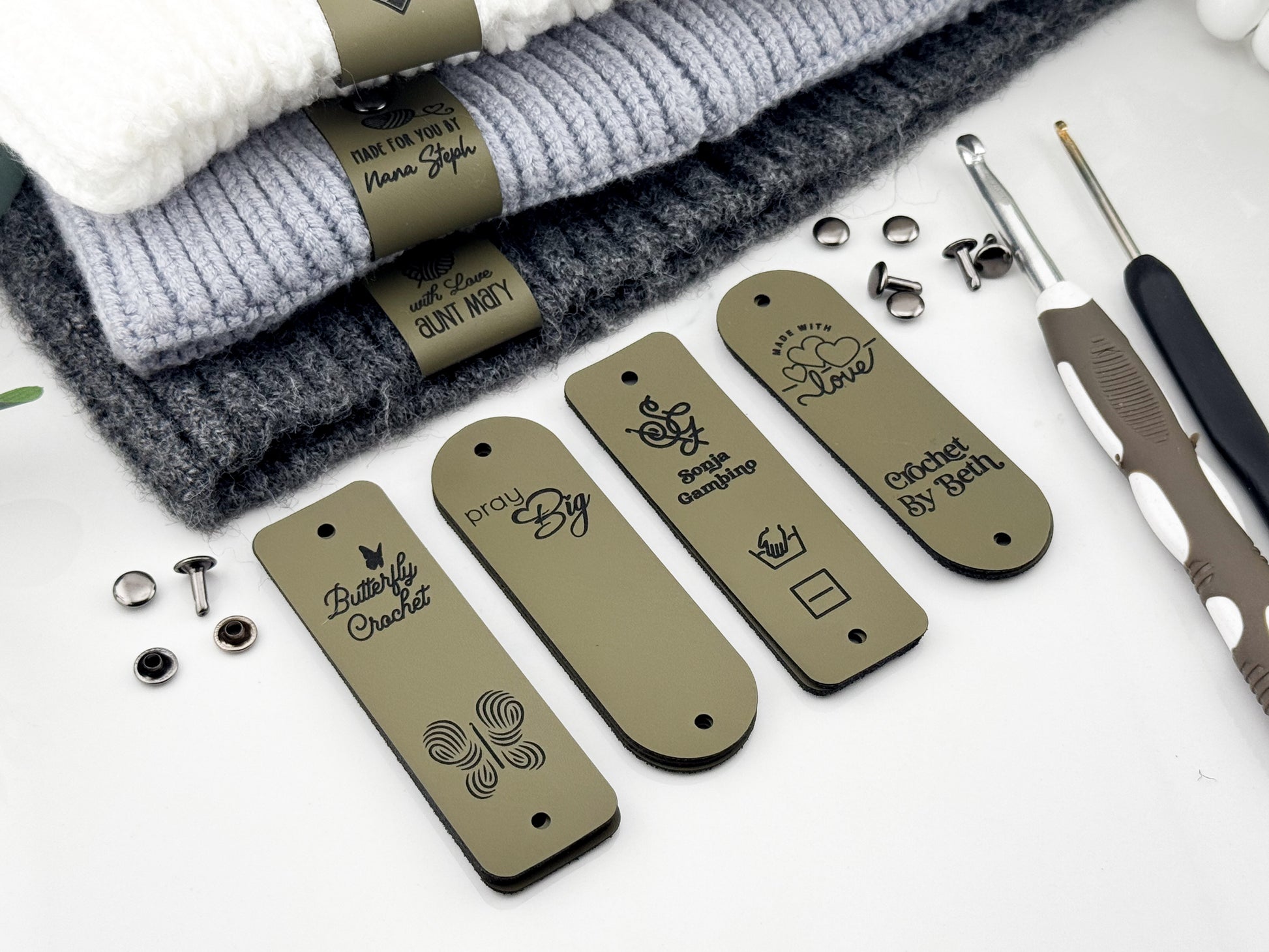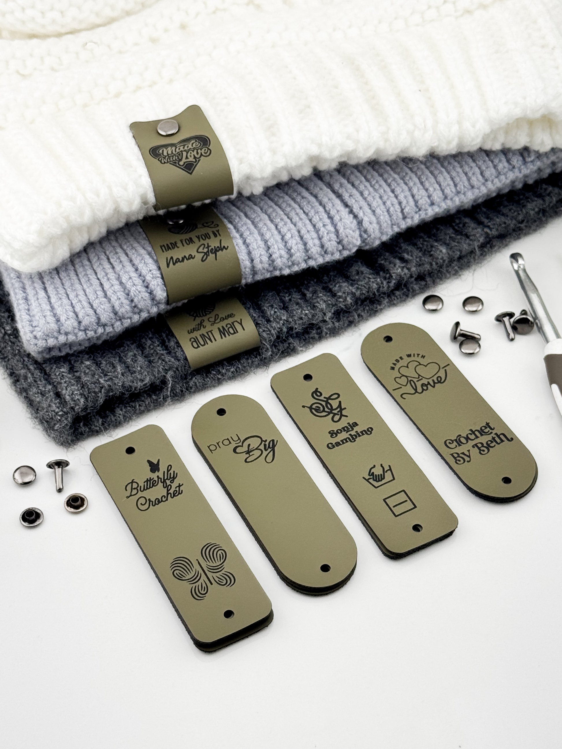 Custom Faux Leather Crochet Tags – 3x 0.95" Personalized Labels with Rivets