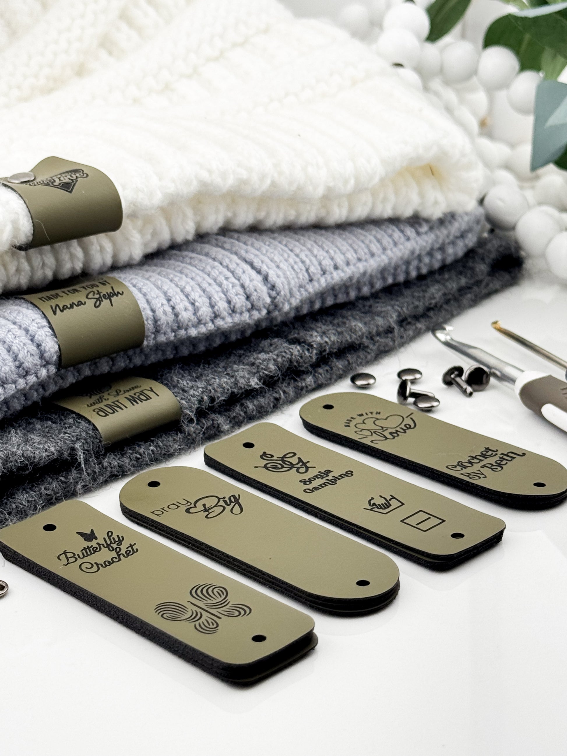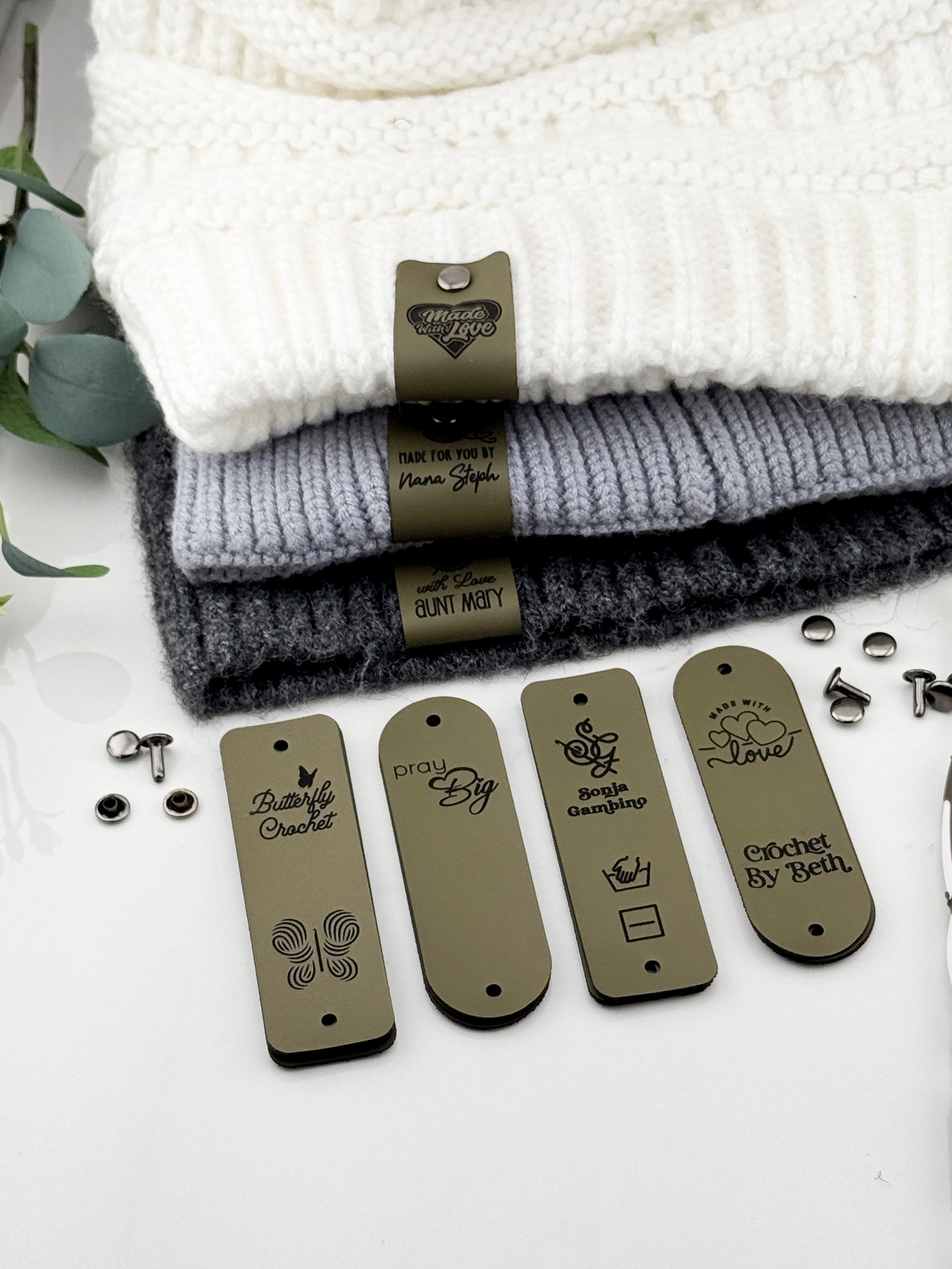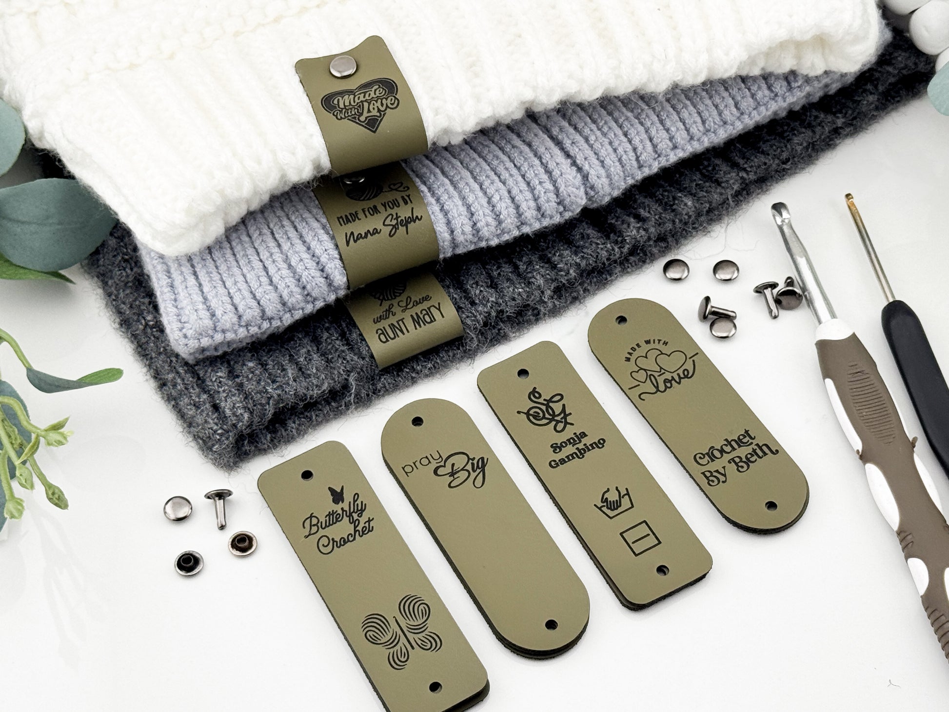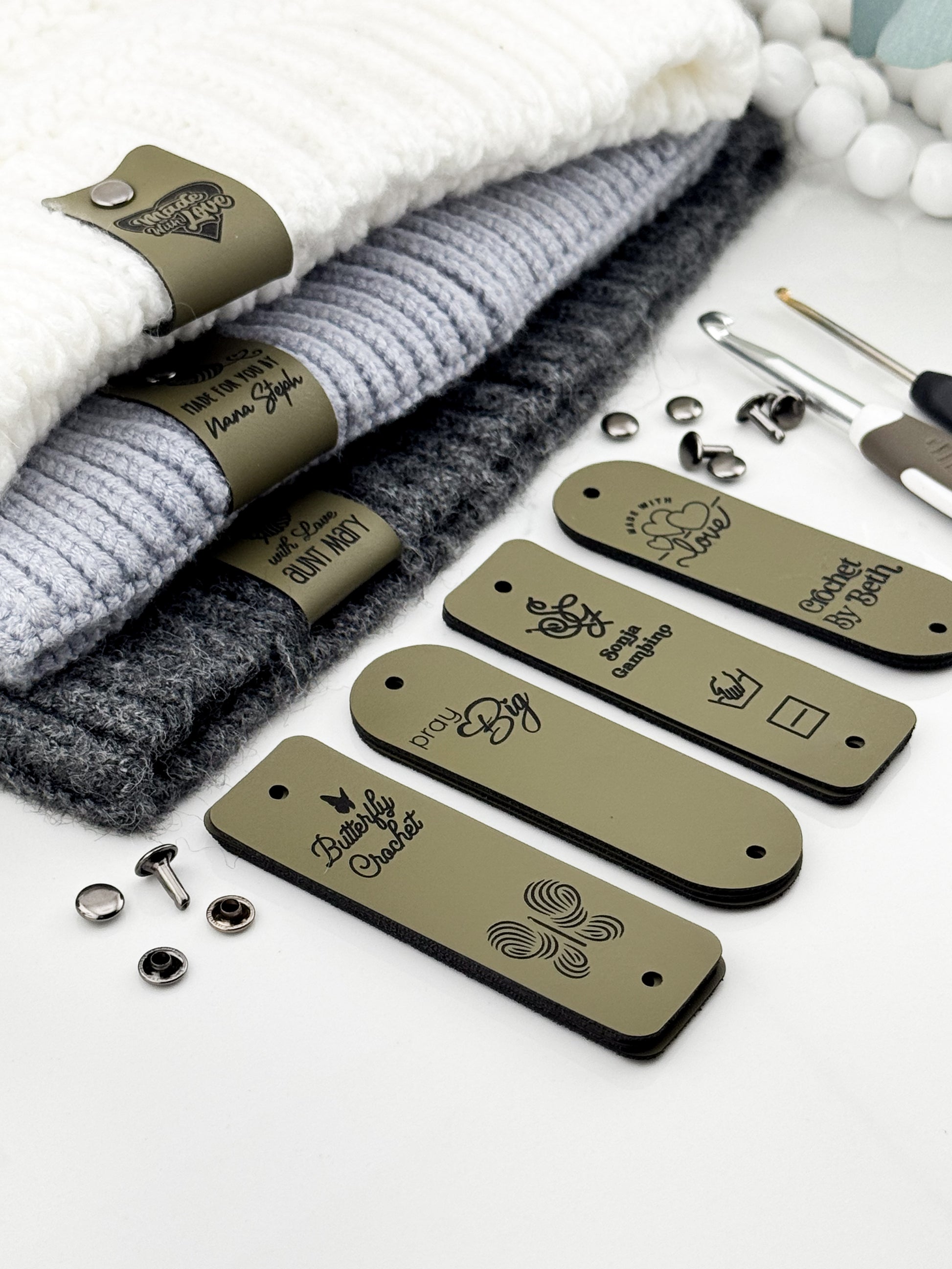 Custom Faux Leather Crochet Tags – 3x 0.95" Personalized Labels with Rivets