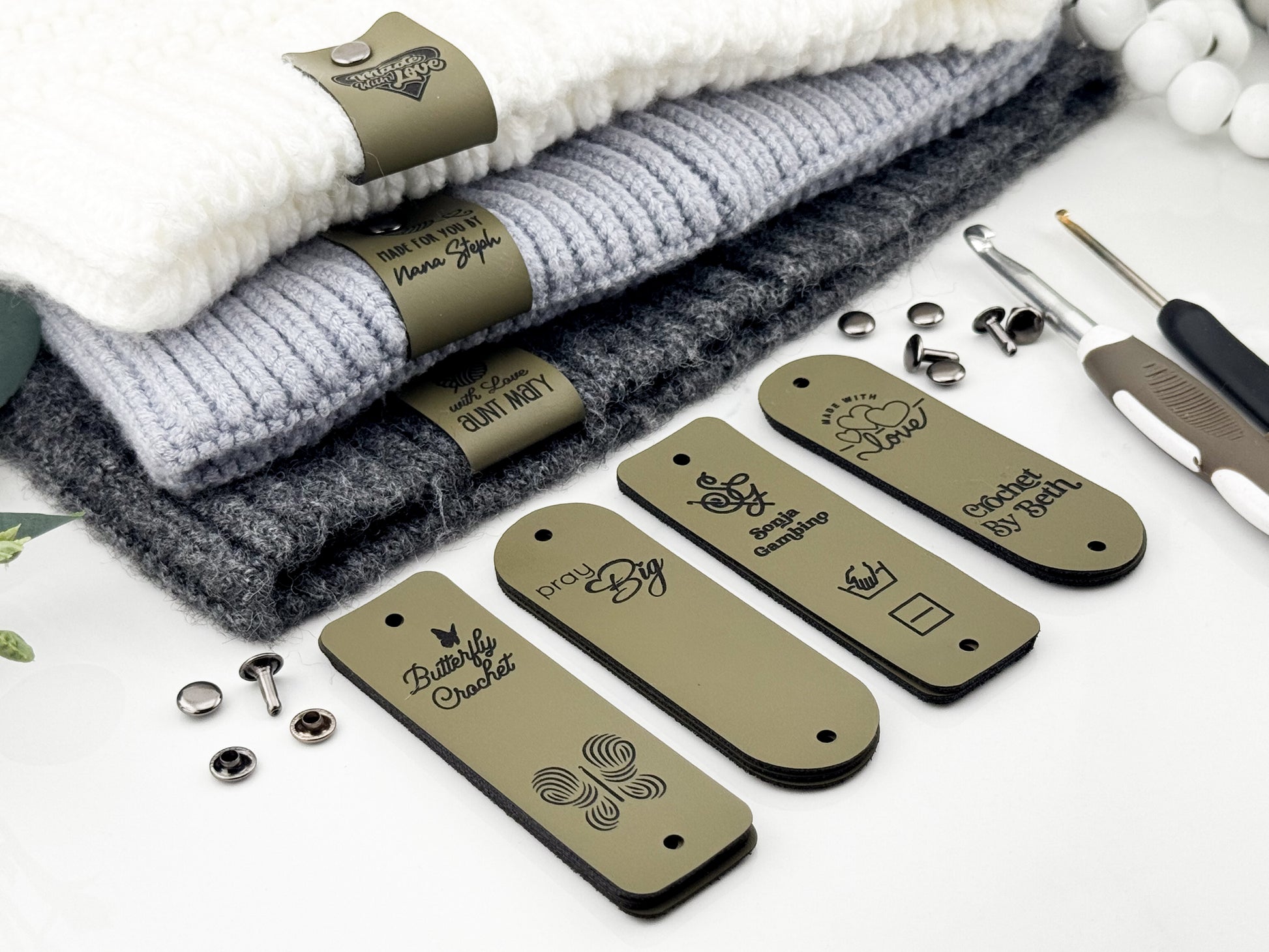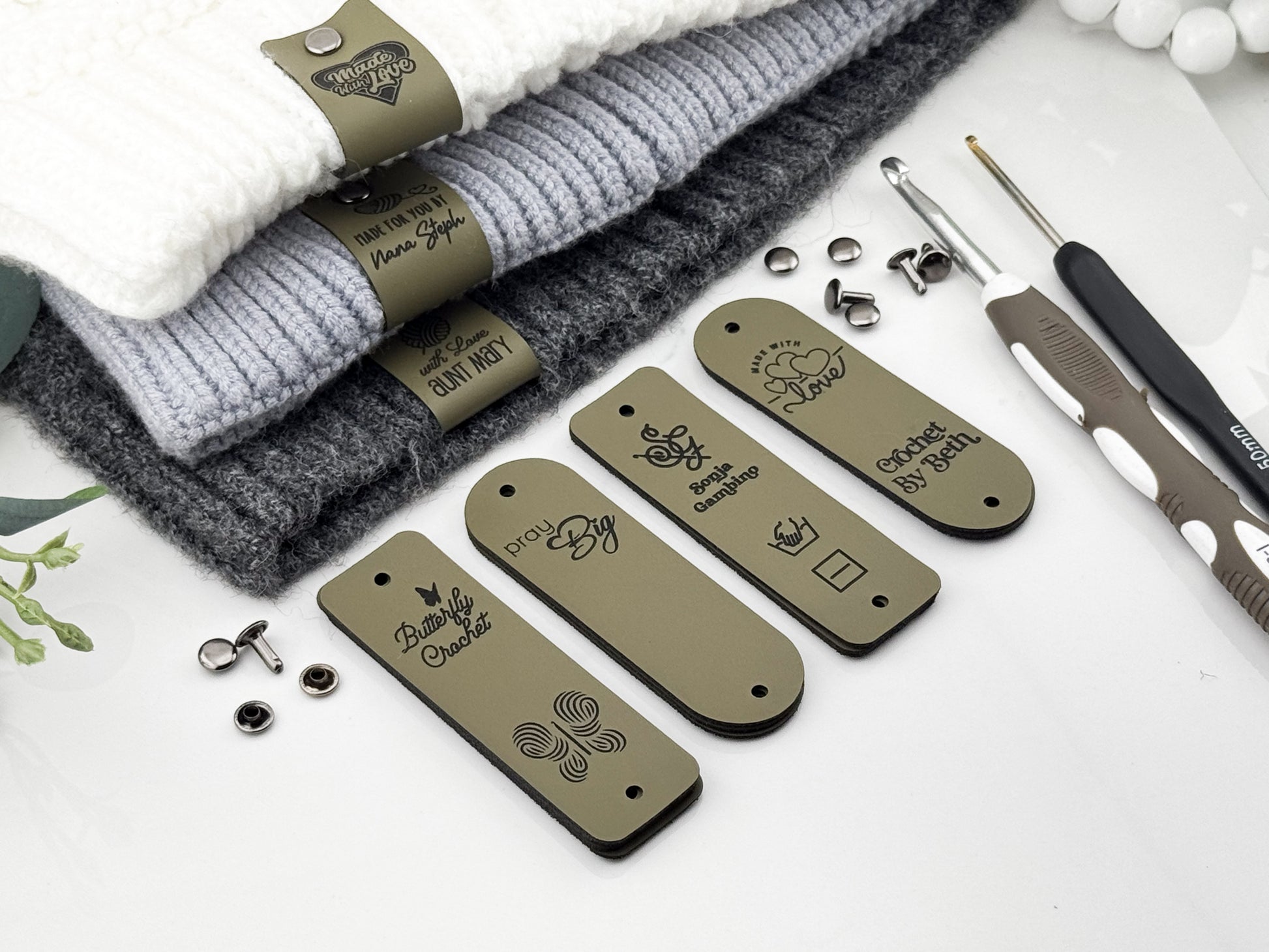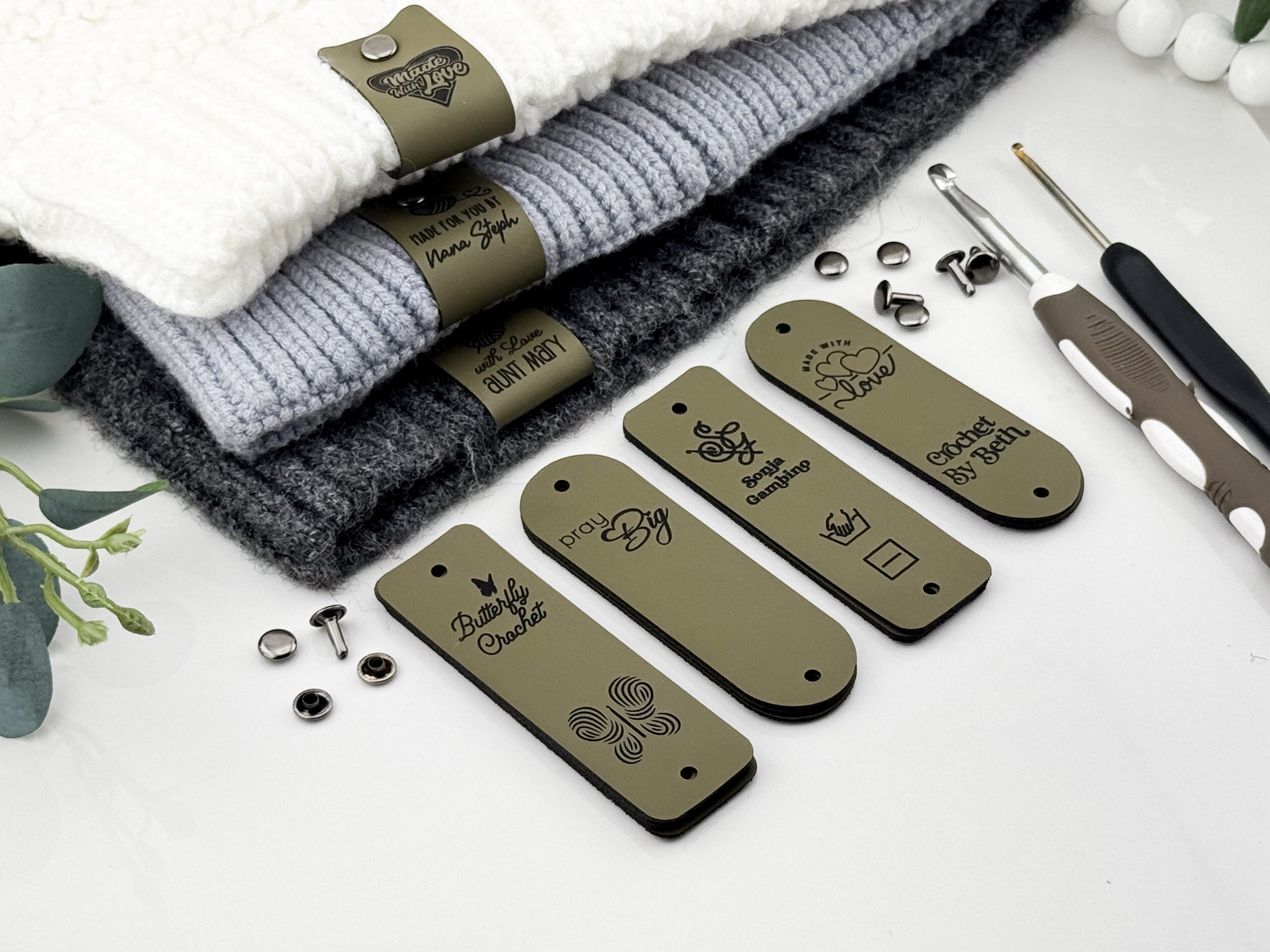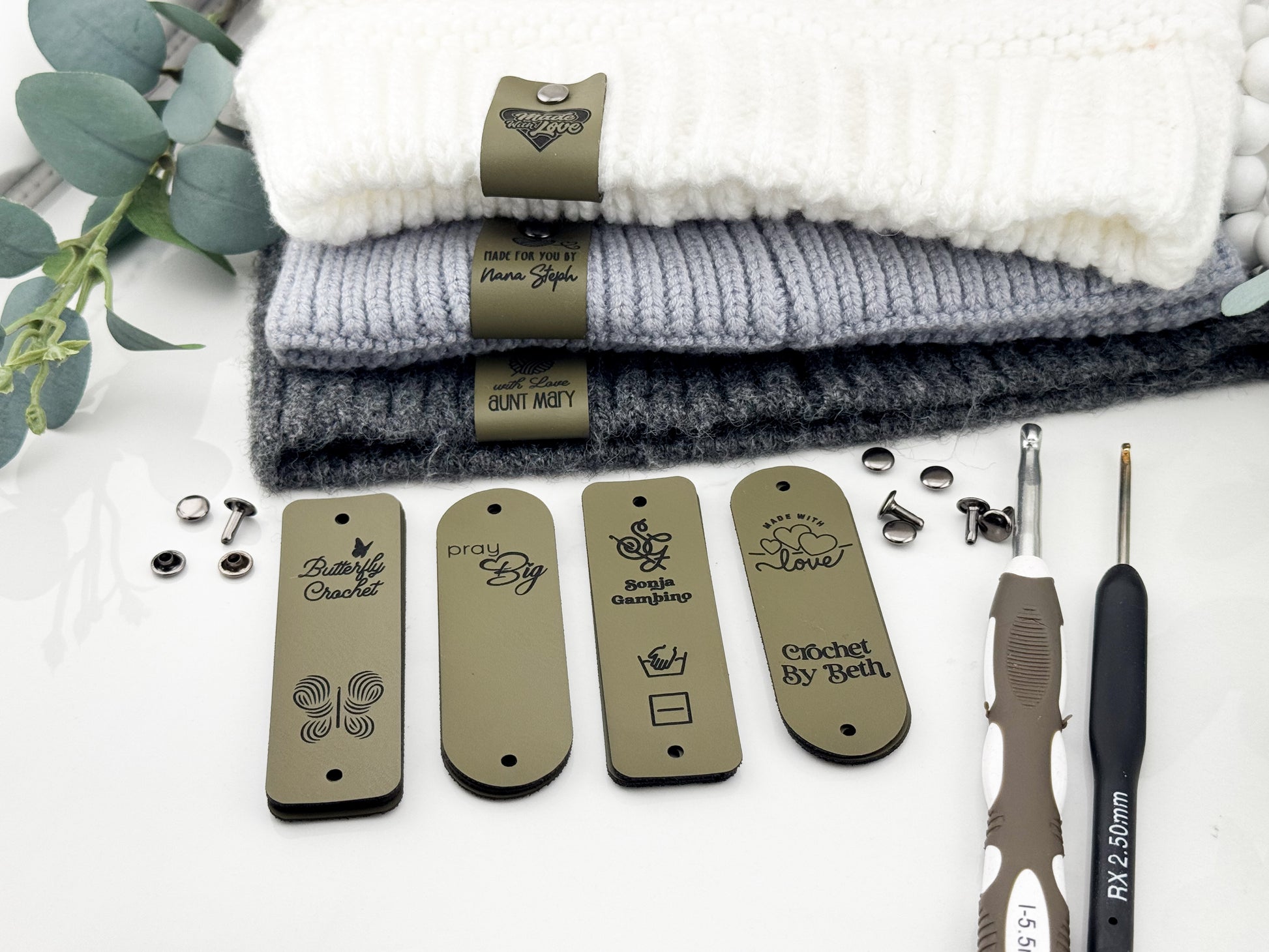 Custom Faux Leather Crochet Tags – 3x 0.95" Personalized Labels with Rivets