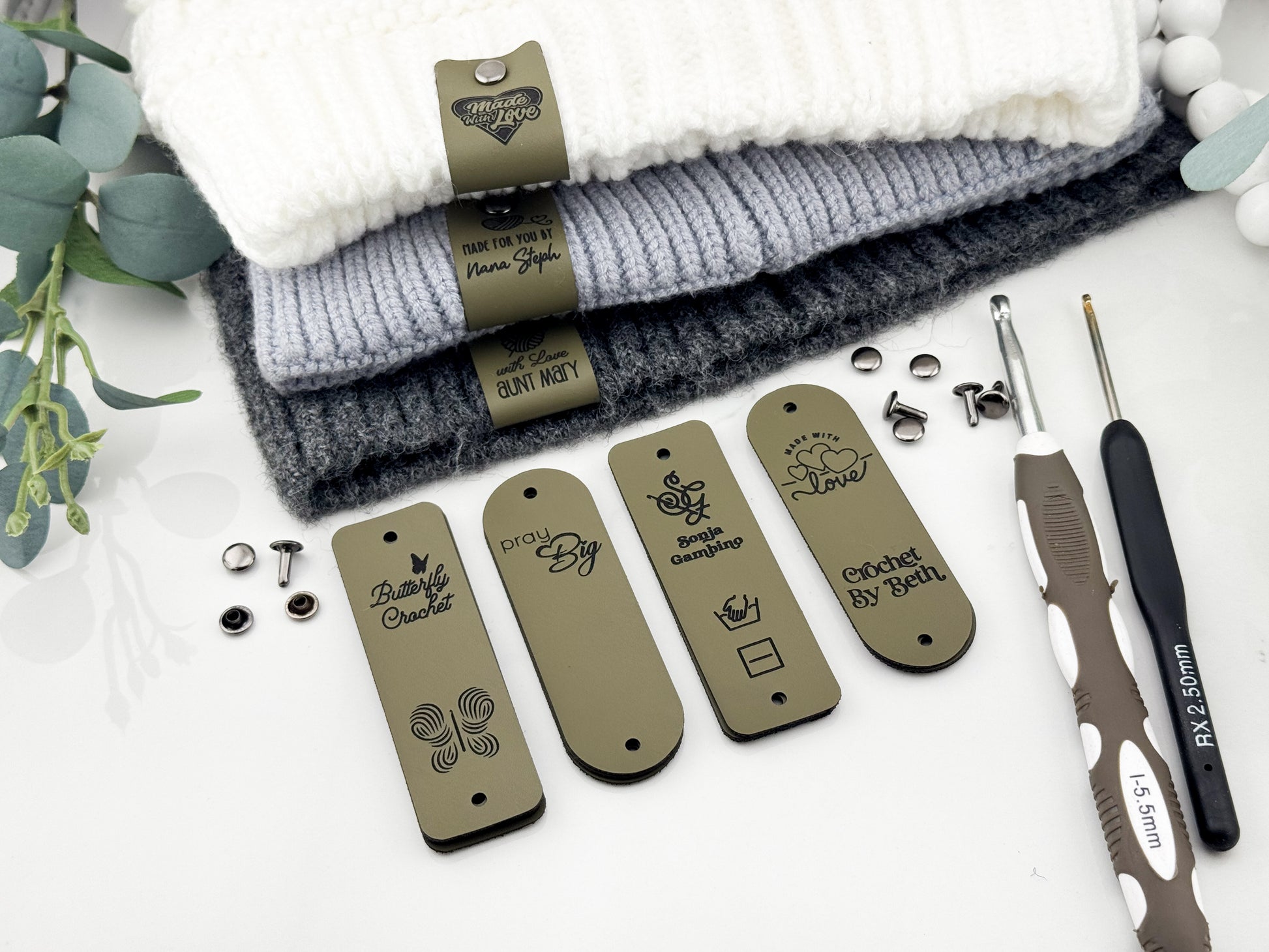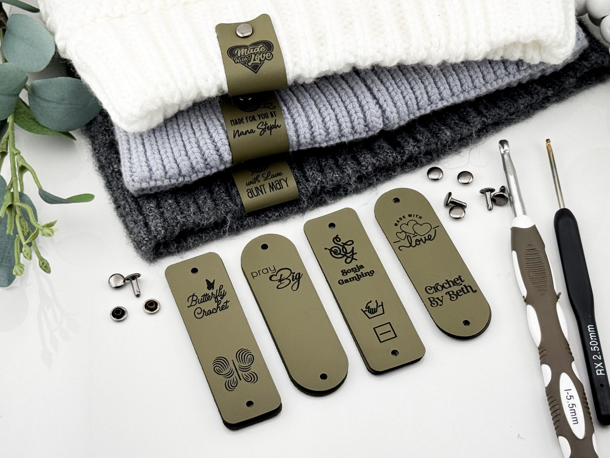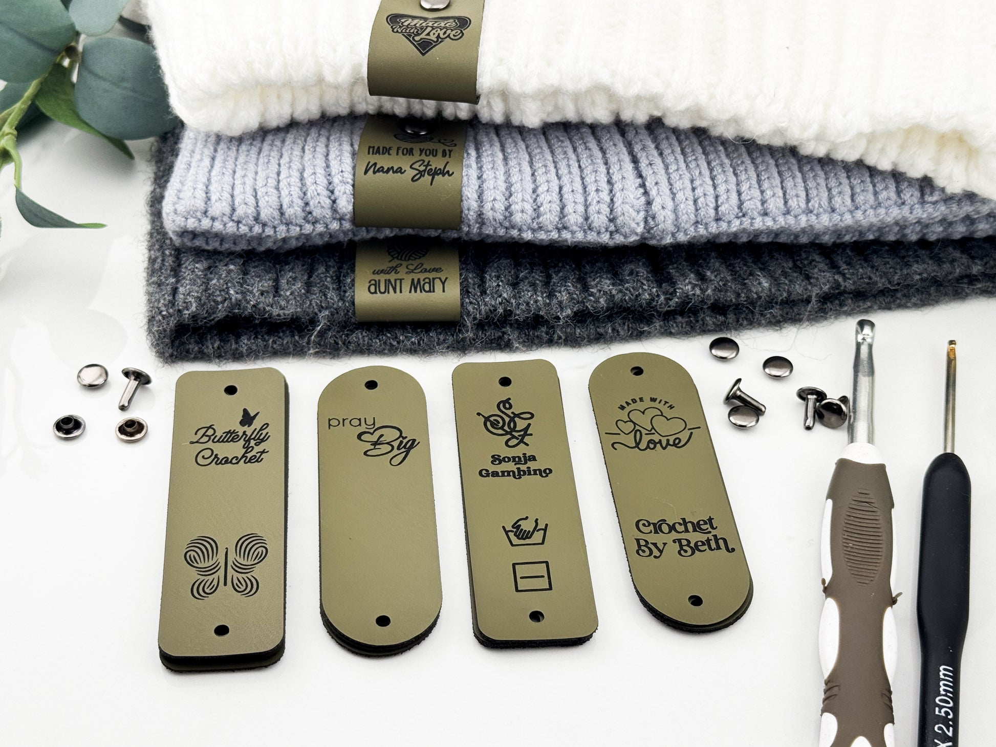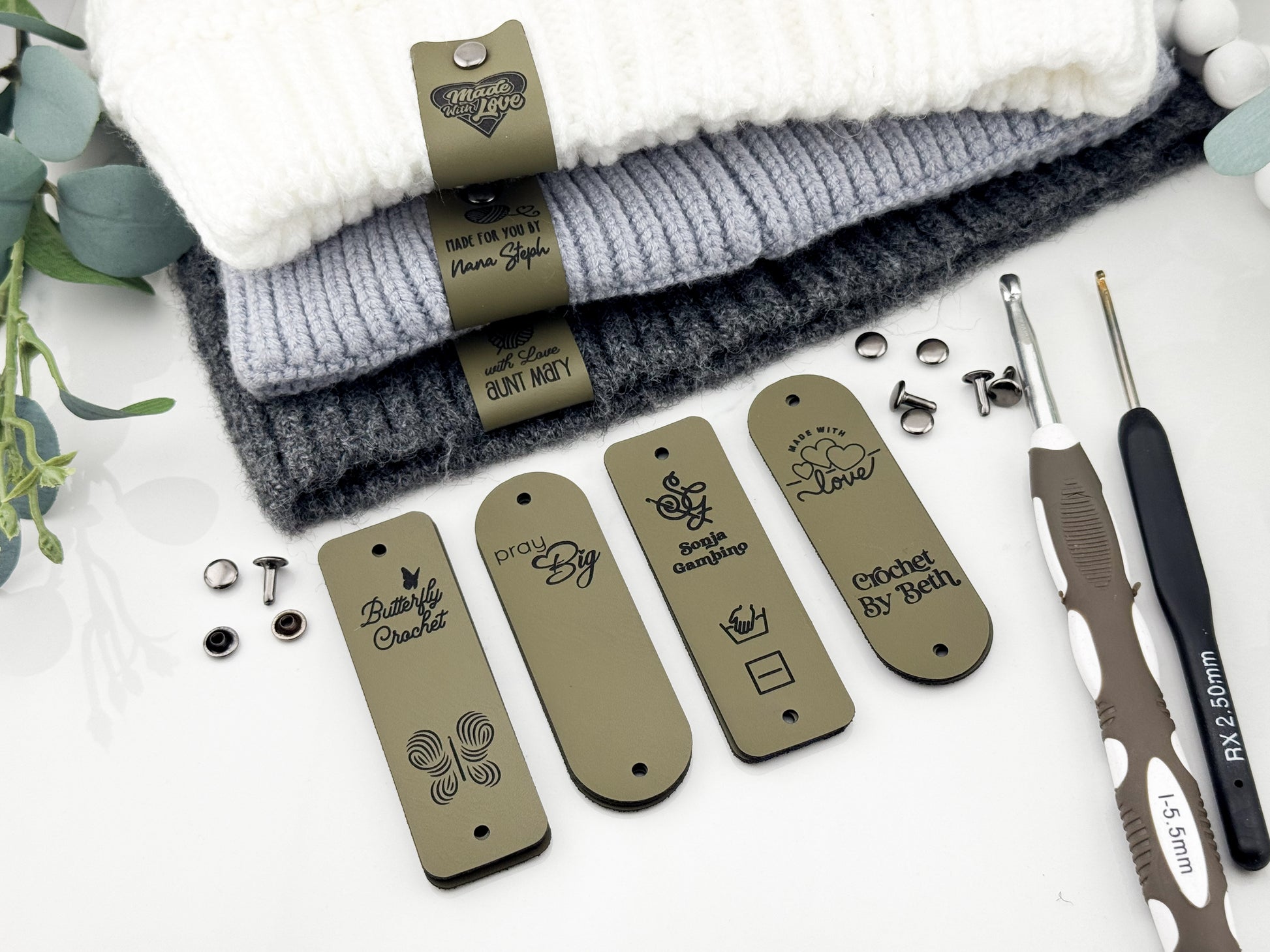 Custom Faux Leather Crochet Tags – 3x 0.95" Personalized Labels with Rivets