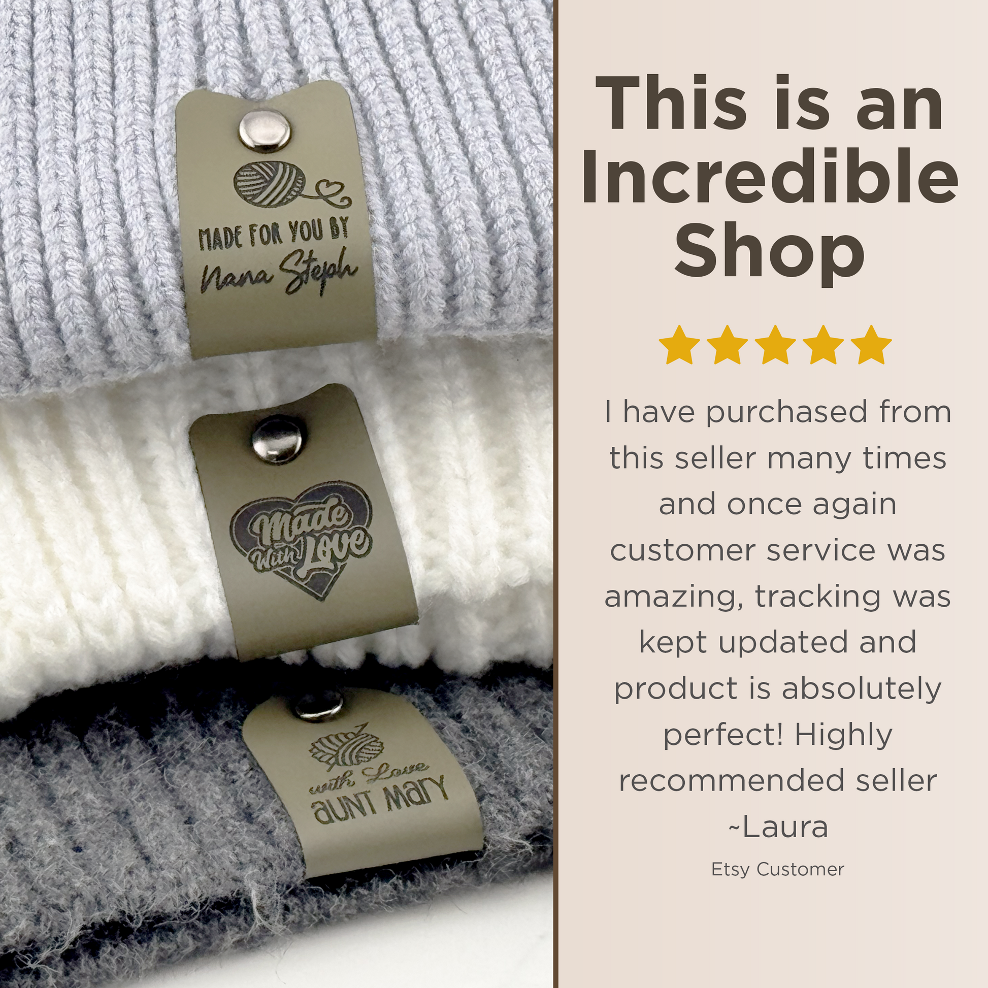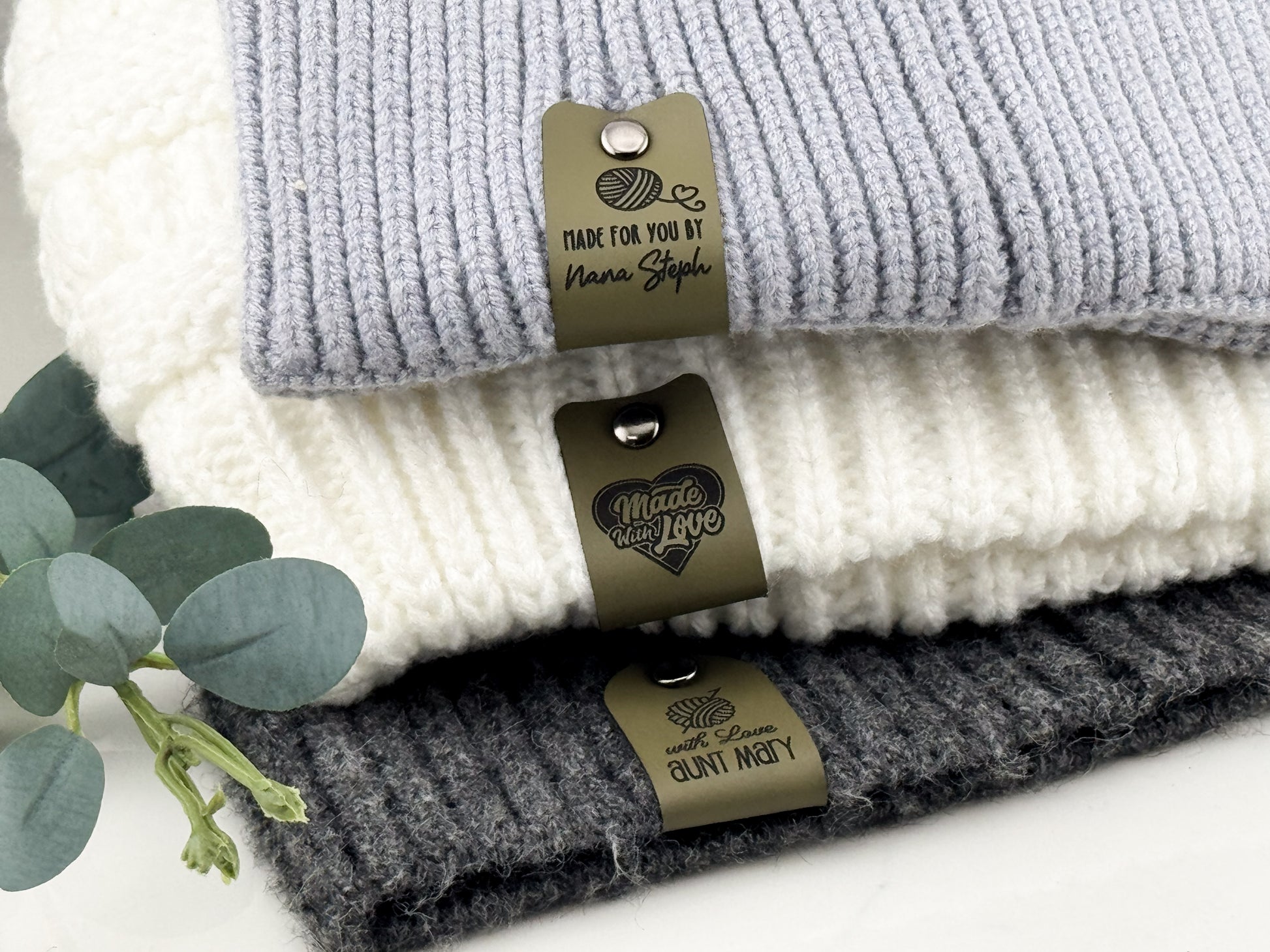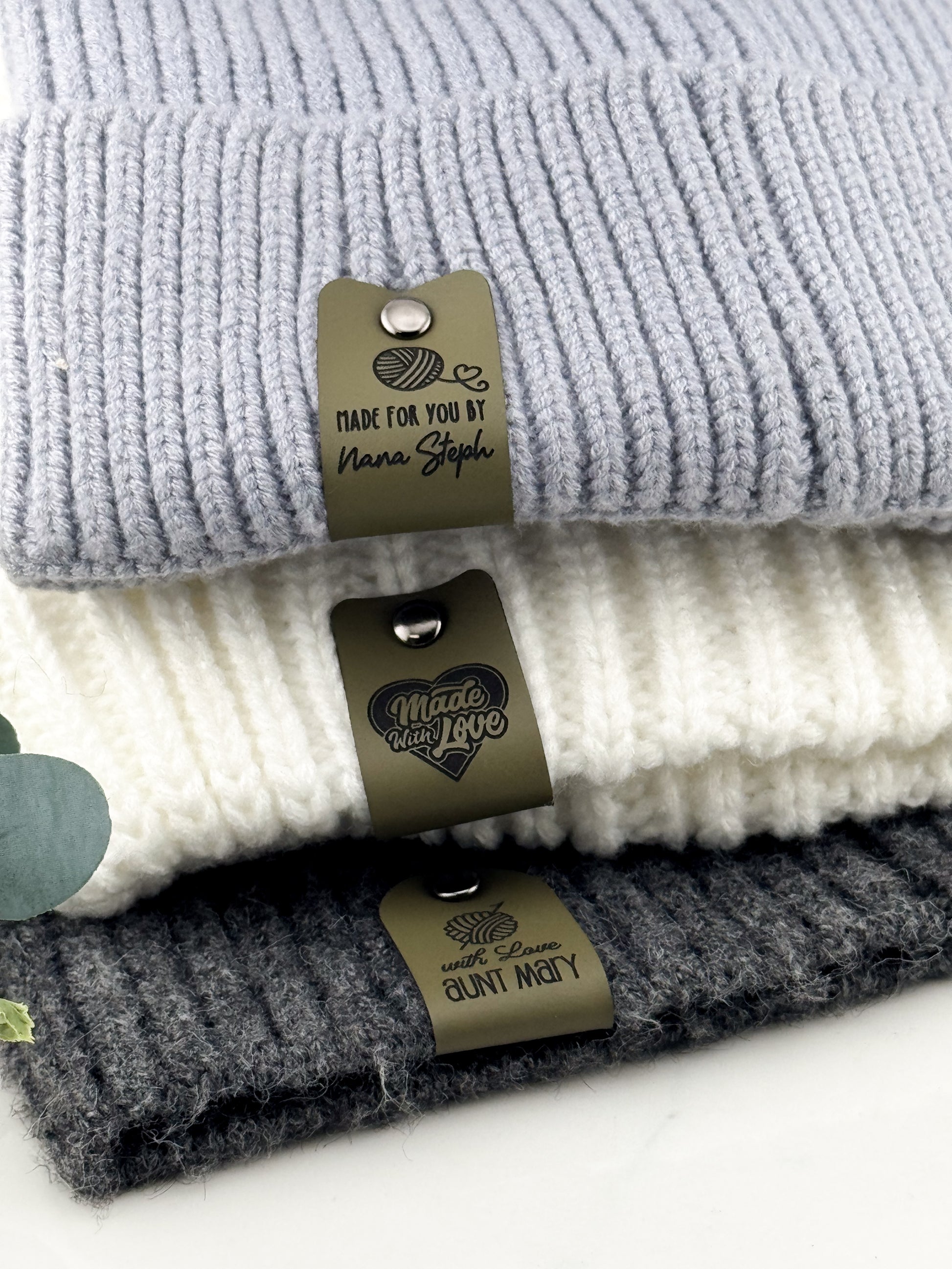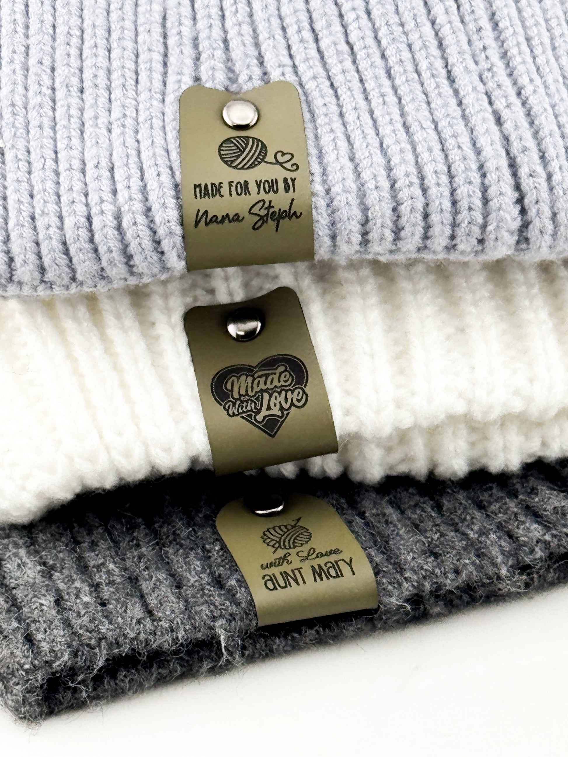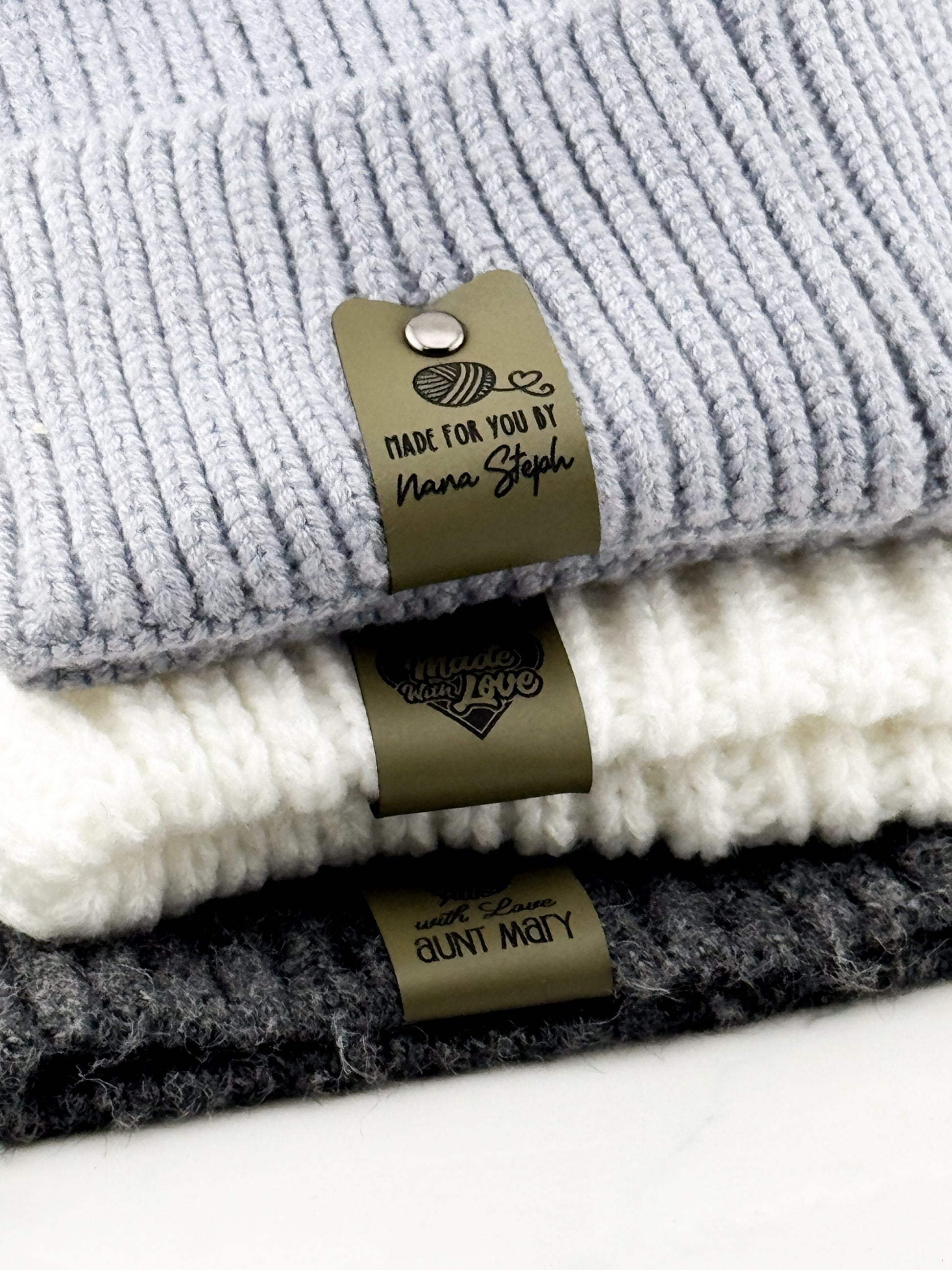 ✨ Designed for comfort and durability, each tag is crafted from buttery-soft faux leather with a cozy felt backing—gentle on yarn, tough enough for repeated washes.